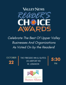 Wednesday, October 22 from 5:30-8pm. Appetizers and Dinner included. Purchase tickets and register here. Hosted by the Upper Valley Business Alliance & the Valley News!